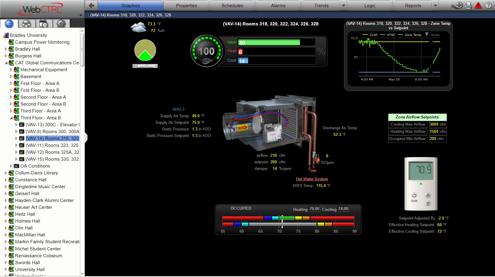 BU engaged ECSI to help develop an upgrade solution. In tandem, ECSI’s Energy Services Team worked with BU and the Ameren Illinois utility rebate program to secure a custom incentive to help offset the costs of the project. The project secured nearly $38,000 in rebates! Upon approval of the plan and utility rebate, ECSI performed the upgrade while the building was occupied and was required to keep the HVAC equipment in operation to maintain comfort. New Automated Logic control modules, panels, sensors, transmitters, and actuators were installed and commissioned while custom equipment and floorplan graphics were developed to provide the facility staff with a first-class interface.